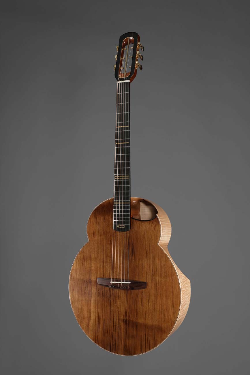 Guidé par le travail des luthiers contemporains (Ken Parker, Thierry André, Michihiro Matsuda, Fred « kopo » Pons, Jacky Walraet, Jean-Yves Alquier…), cet instrument est un hybride entre lutherie acoustique et lutherie électrique.