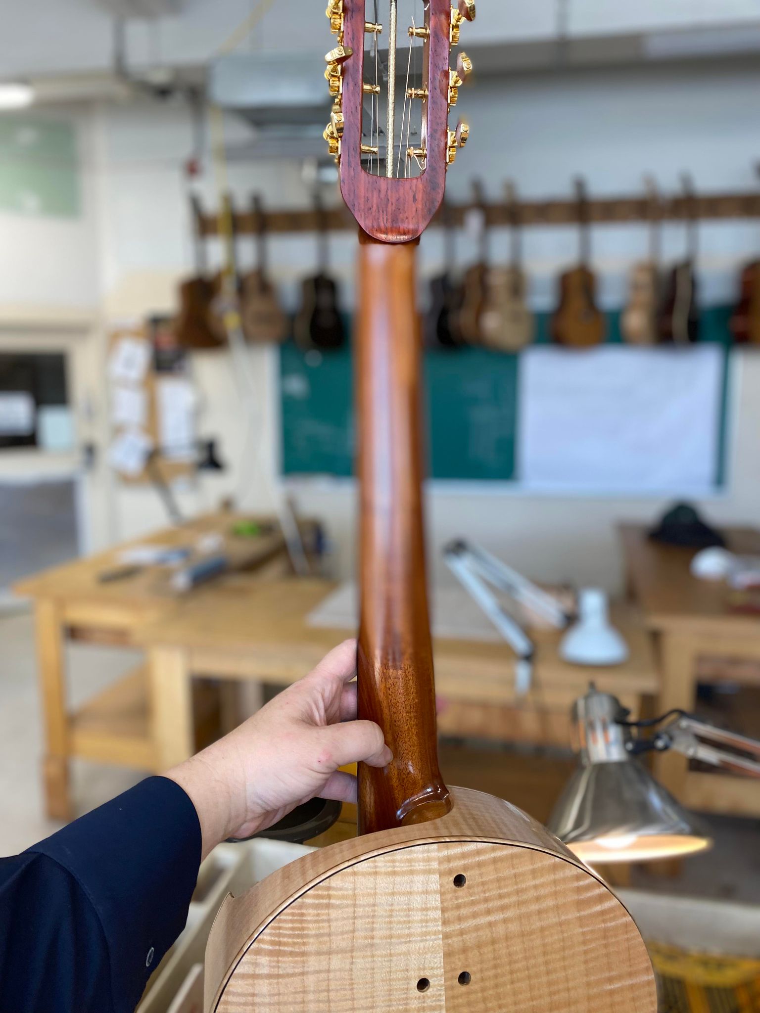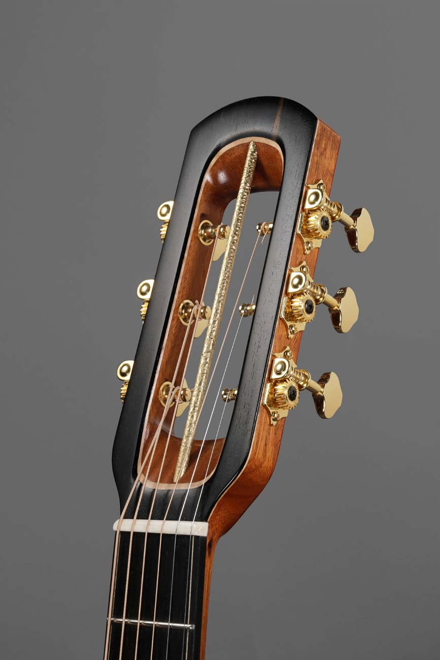 La jonction caisse/manche est au coeur de cette guitare : l’ouïe déportée constitue également un pan coupé. L’accès aux aigues est remarquable, renforcé par l’absence de talon. La table, dépourvue de rosace, est plus solide dans l’axe de tension des cordes. Ceci permet une meilleure réactivité de l’instrument.
