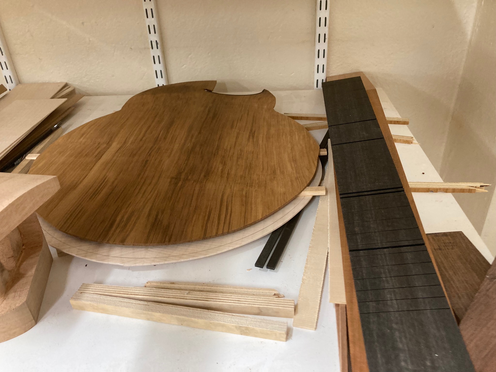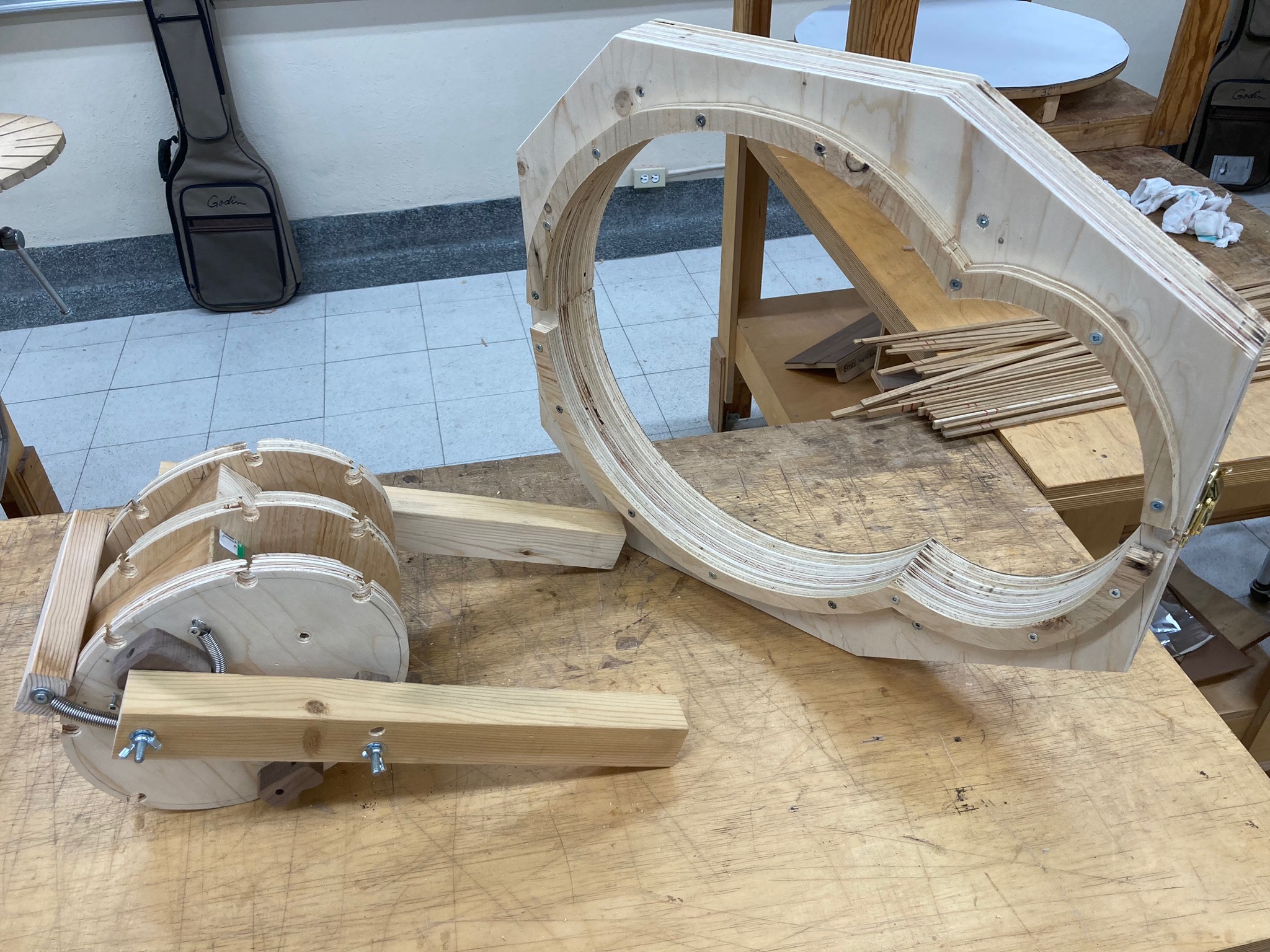 Ci-dessous : différentes étapes dans la construction. Celle-ci commence par le dimensionnement puis le façonnage des différentes pièces de la guitare. En parallèle, j’ai fabriqué les moules et les cintreuses nécessaires à cette silhouette particulière.