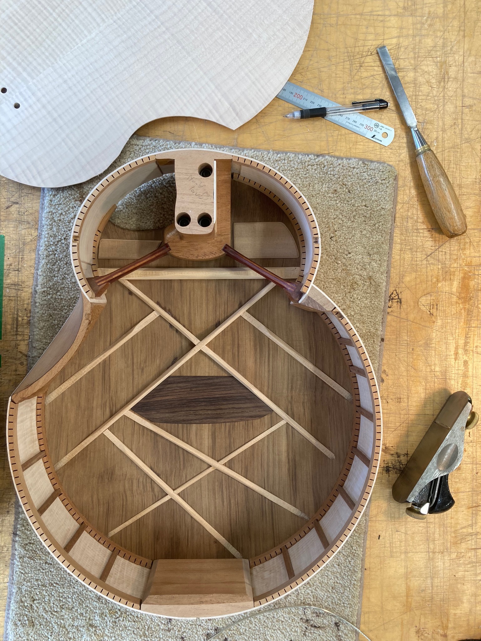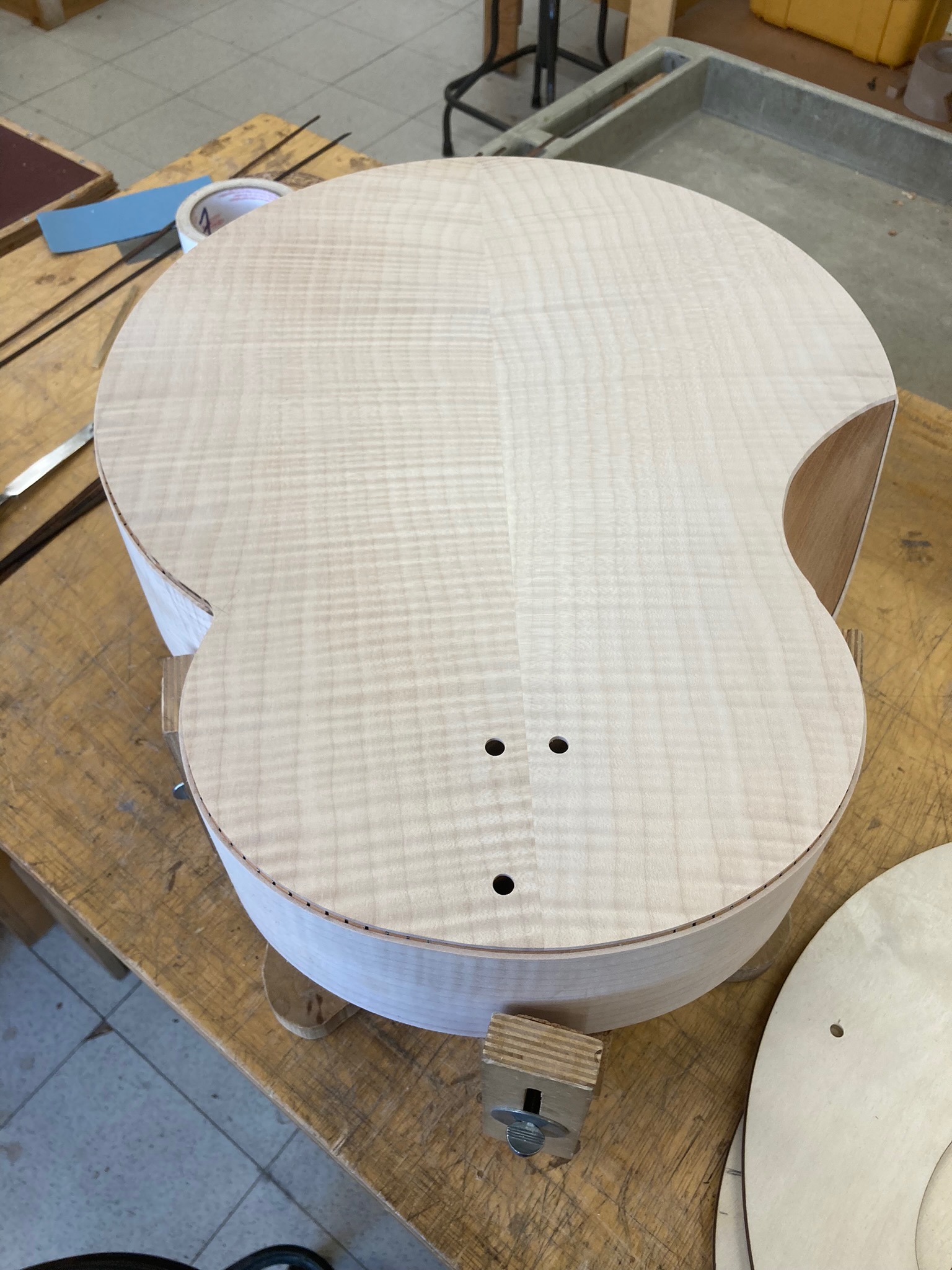 Réalisée à la fin de ma formation à l’École Nationale de lutherie de Québec, elle représente ma réponse à mes préoccupations en lutherie (basses puissantes, homogénéité du timbre, confort de jeu, puissance, accès aux aigues…). D’abord simple dessin dans un cours de créativité (ou je cherchais à simplifier les formes au maximum), cet instrument est devenu un concentré d’expérimentation.